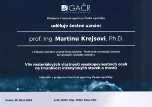 5.11.2025 Prof. Martin Krejsa z fakulty stavební, Vysoké školy báňské – Technické univerzity Ostrava obdržel čestné uznání předsedy Grantové agentury České republiky (GA ČR) za excelentní výsledky standartního projektu „Vliv materiálových vlastností vysokopevnostních ocelí na trvanlivost inženýrských staveb a mostů“ (GAČR 21-14886S). Projekt byl úspěšně řešen ve spolupráci s doc. Stanislavem Seitlem z Ústavu fyziky materiálů AV ČR, v. v. i.